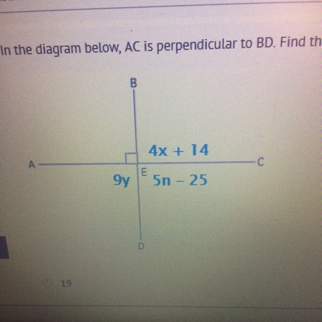 In the diagram below, AC is perpendicular to BD. Find the measure of angle AEB. A: 19 B: 23 C: 10 D: 90