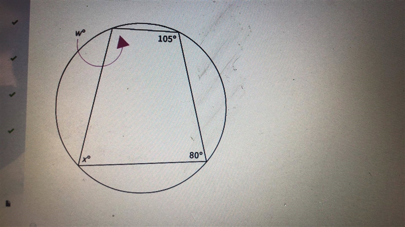 w = 360 ° - x - 80 ° - 105 °, where x = 75 °, then