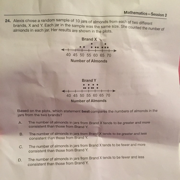 B, because brand x goes all the way up to 70, but brand y doesn't, except, brand x is the only one that goes down to 50, so it's not as consistent.
