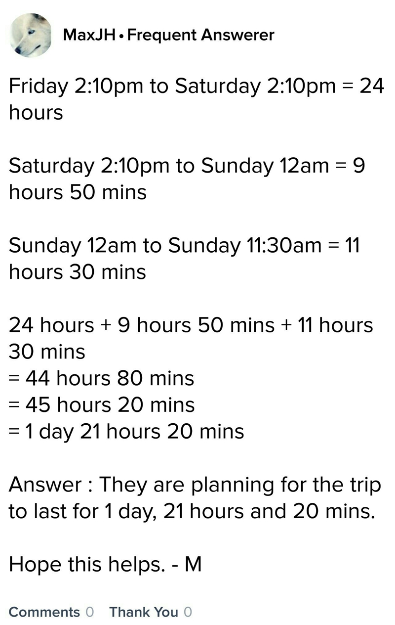 Dominic and Terrell plans to start their weekend backpacking trip on Friday at 2:10 pm and return home on Sunday at 11:30 a.m. How many days,hours, and minutes are they planning…