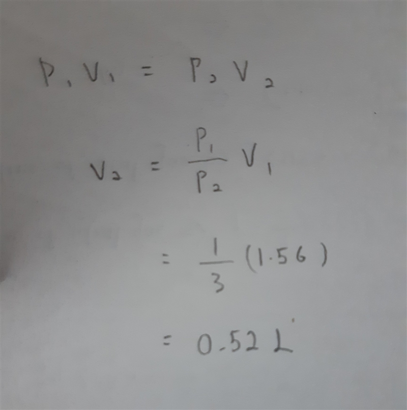 A gas occupies 1.56 L at 1.00 atm. what will the volume be if the pressure becomes 3.00 atm