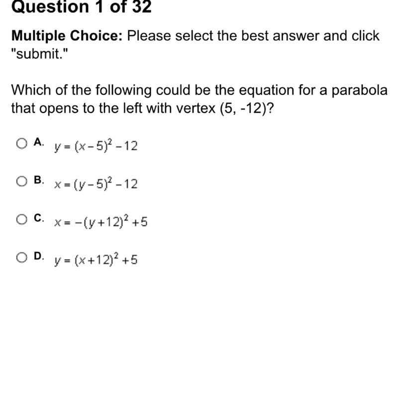 It is given that the vertex of the parabola is (5,-12) and it opens to the left.