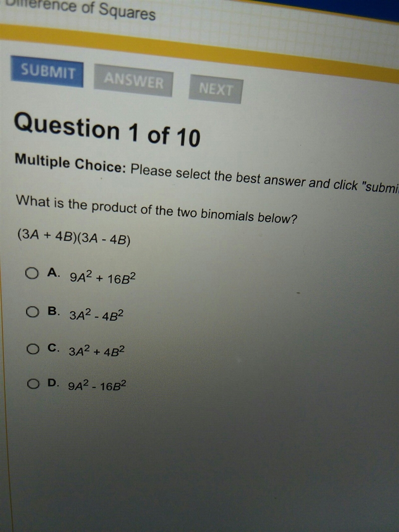 This is a difference of squares, meaning that when you multiply the binomials it would be the front term squared minus the last term squared.
