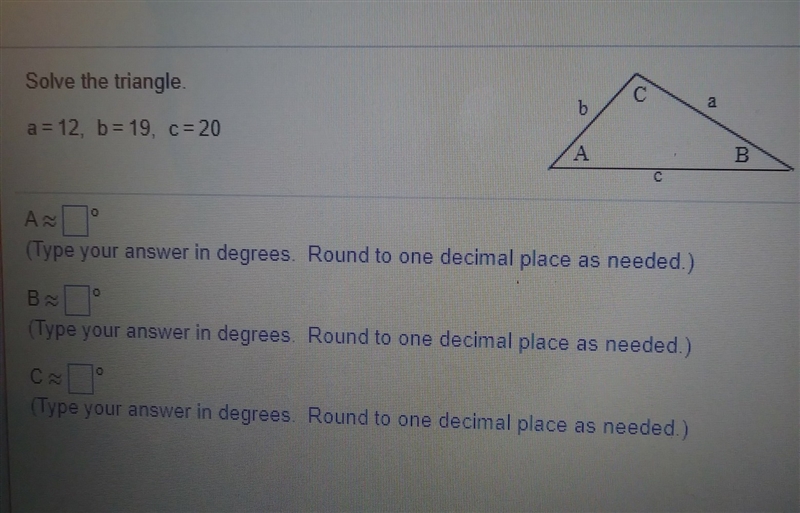 ![a^2 = b^2 + c^2 -2bc \cos A \\ -2bc \cos A = a^2 - b^2 - c^2 \\ \\ \cos A = (a^2 - b^2 - c^2)/(-2bc) \\ \\ A = \cos^(-1)\left[ (a^2 - b^2 - c^2)/(-2bc) \right] \\ \\ A = \cos^(-1)\left[ (12^2 - 19^2 - 20^2)/(-2(19)(20)) \right] \\ \\ A = 35.723697](https://img.qammunity.org/2019/formulas/mathematics/high-school/dhs6lzo8577ai03bfeh5jxen47ucxp6vhh.png)