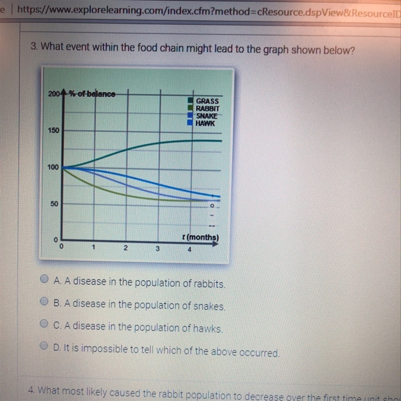Because the rabbit population was the first to decrease, it is most likely that the disease occurred in the rabbit population, once this happen the snake population then decreased because its food supply (the rabbits) decreased. Since the snake population decreased, the hawk feeding on the snake population also decreased.