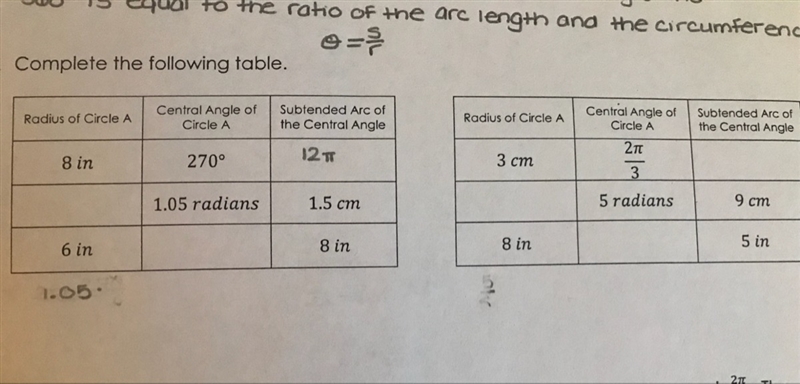 The third lines of both tables need the angle. Since the formula is already solved for theta, the central angle, just plug in s and r and calculate theta.