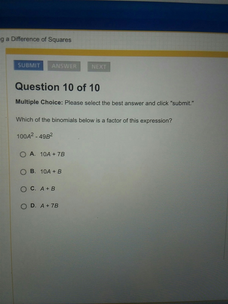 100A²-49B²=10²A² - 7²B²= (10A-7B)