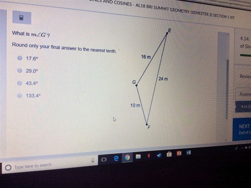 24 ^ 2 = 10 ^ 2 + 16 ^ 2 -2 * 10 * 16 * cos (G)