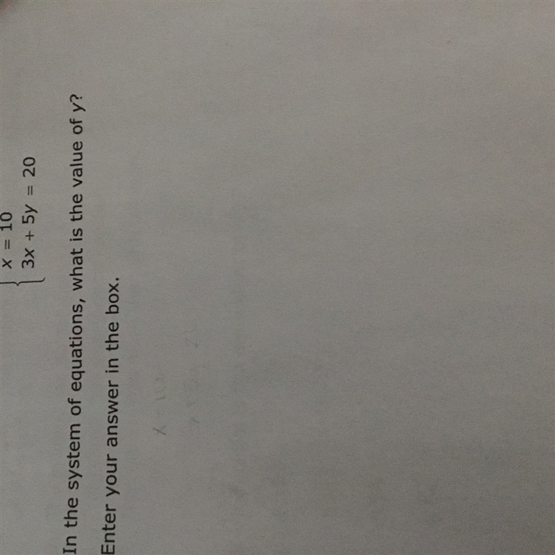 If x is equaled to 10 then you will place 10 into 3 and it would look like this 3(10) + 5y= 20 now your next step is to multiply 3•10=30 so 30+5y=20 now all you have to do is 20- (-30)= -10 and then divide by 5 and it’s equal to -10/5= -2