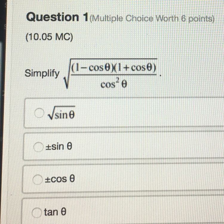 Simplify radical (1-cos0)(1+cos0)/ cos^2 0 HELP ME PLS!! ASAP