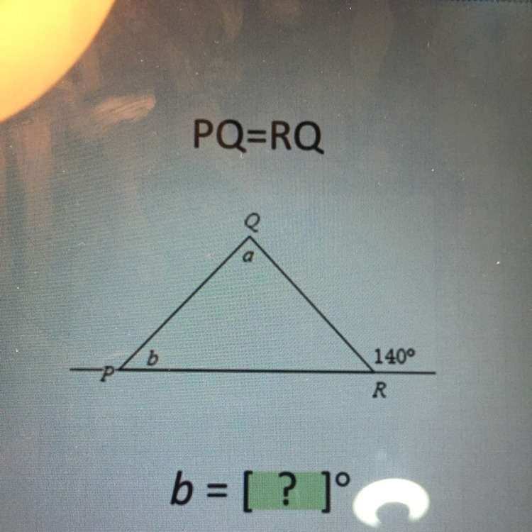 b= 40 degrees, since the 2 lines (pq and rq) are equal, so are their angle measures. knowing that a straight angle is 180 degrees, subtract 140 from 180, and you get the angle measure for b.