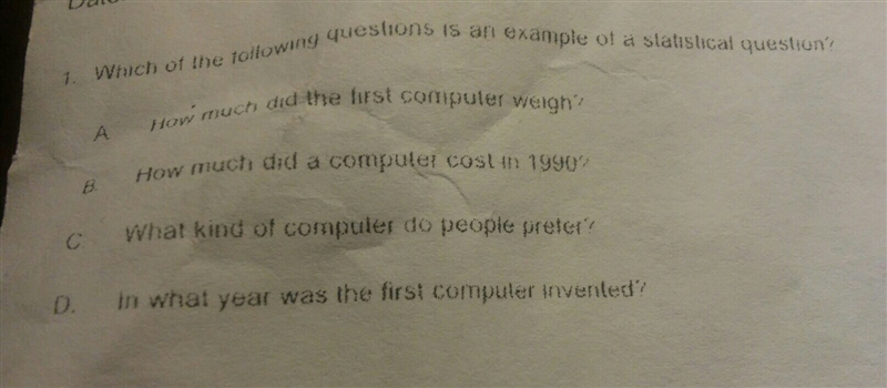 C.)- What kind of computer do people prefer? The reason this is the answer is because there are multiple answers to this. One person could say I like this computer and another person could say I like this computer. The way to know if it's a statistical question is if there are many answers to the question.