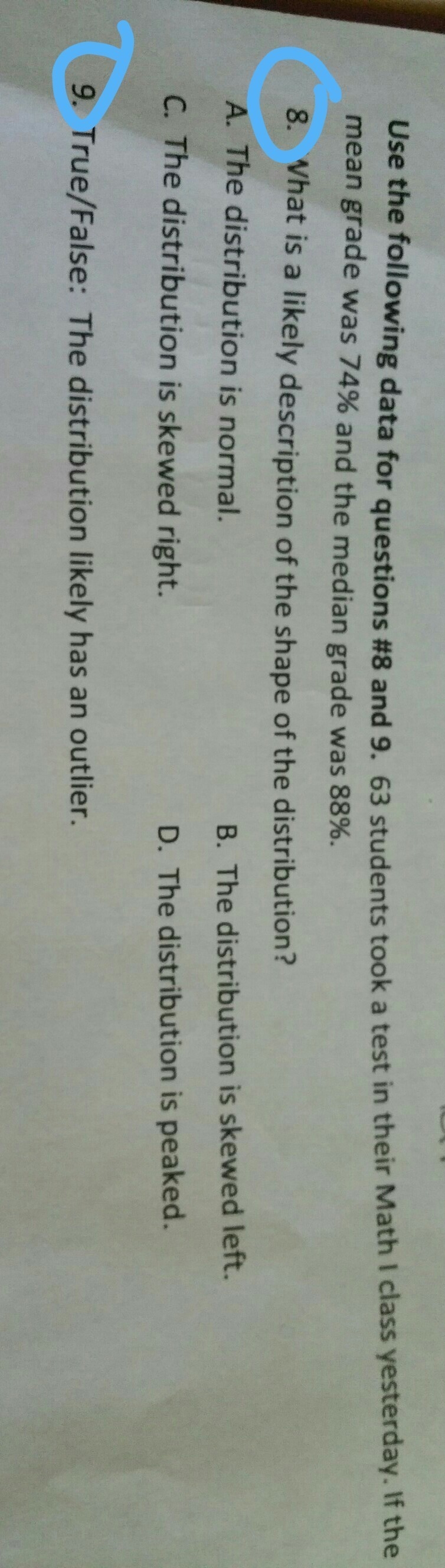 * Math instruction these days rarely recognizes such subtleties. Since it is probable that at least one value is well below the bottom quartile, I've shown my guess at the expected answer as TRUE. In a real set of grades, I expect the tail of the distribution to have enough low grades that they cannot be considered to be outliers.