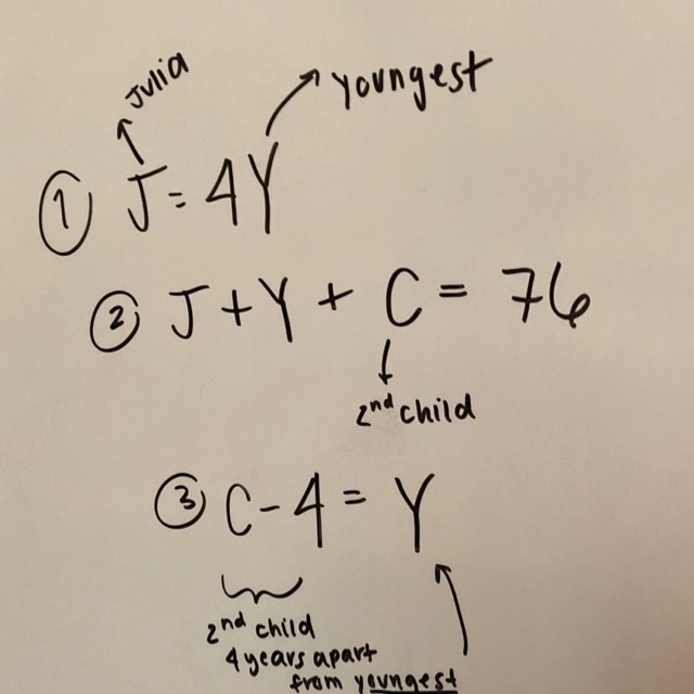 Use these 3 equations to solve for J (age of Julia), C (age of 2nd child), and Y (age of youngest child). You find these equations by using common sense from the problem.