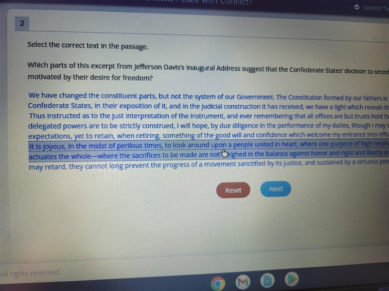 Which parts of this excerpt from Jefferson Davis’s Inaugural Address suggest that-example-1