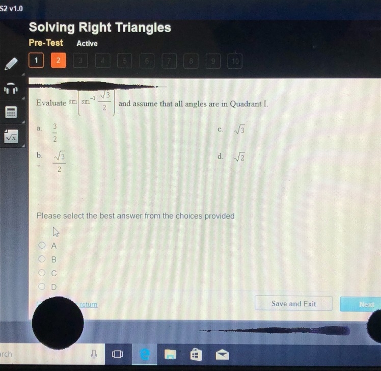 . So if you're taking the sin of its inverse, what you get back is what you started with. The sin of the inverse sin of sqrt(3)/2 is sqrt(3)/2, choice b.