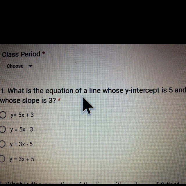 What is the equation of a line Y intercept is five and slope of 3