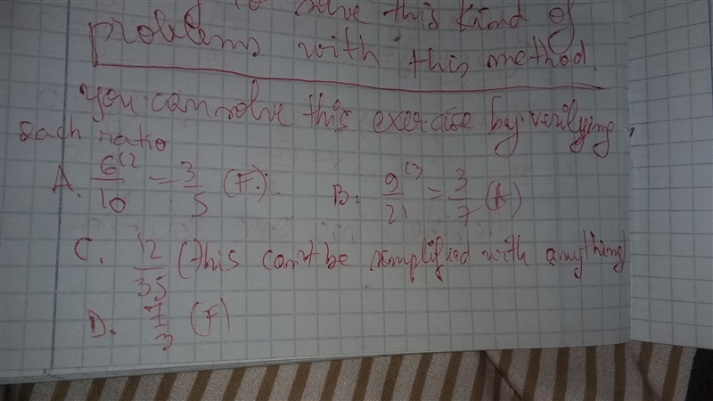 Which ratio is equivalent to 3/7? A. 6 to 10 B. 9:21 •• C. 12/35 D. 7 to 3