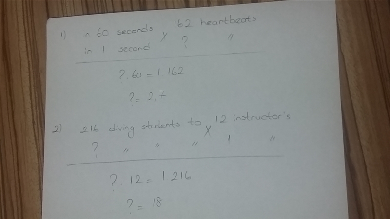 Write each ratio as a unit rate. 1. 162 heartbeats in 60 seconds 2. 216 diving students to 12 instructor's