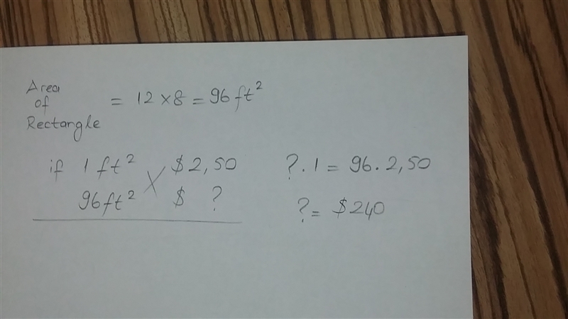 jen.wants to tile the floor of her kitchen. The floor is rectangular and measures 12 feet by 8 feet if it costs 2.50 per dquar feet for the material, wha is the total cost of the material for tiling the