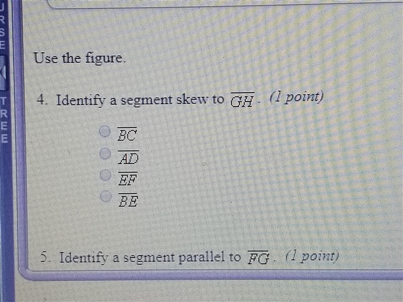 Identify a segment skew to gh. what is the answer to it? bc, ad, ef, or be.
