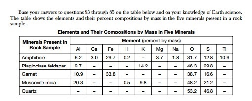 Base your answers to questions 83 through 85 on the table below and on your knowledge of Earth science. The table shows the elements and their percent compositions by mass in th…
