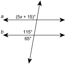 If they're parallel the other number in the same spot as 5x+15 equals that, so 5x+15=115 because if they are parallel they're the same if same spot and same line going through them.