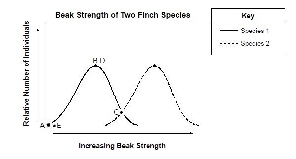 By looking at the graph, species 1 has the weaker beak because the majority of the population is at the low end of the graph. More of the species 1 is at the low strength end of the graph.