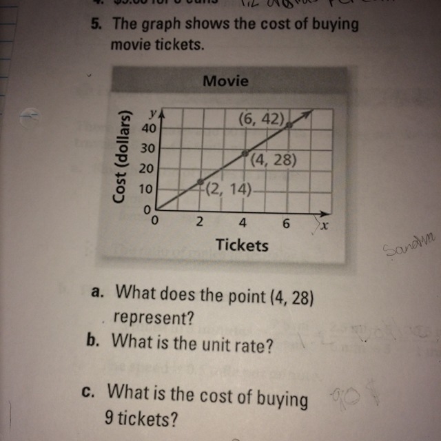 A: The point (4,28) represents that 4 movie tickets are $28.