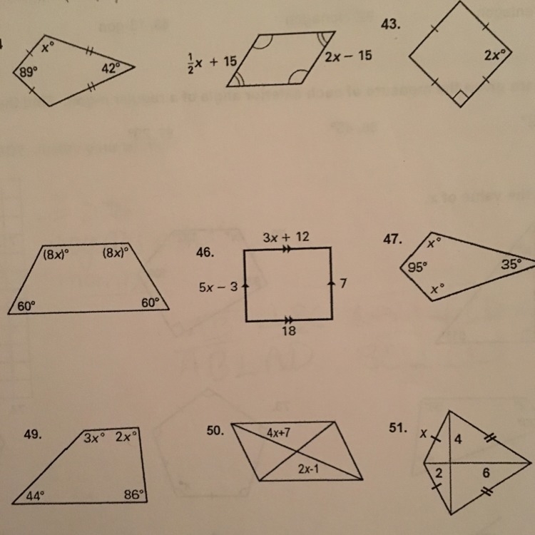 43. This one is a square since all sides are congruent. All of the angles in a square must be 90 degrees, therefor you set 2x=90. This gives you x=45