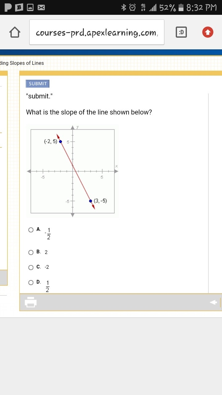 The answer is C. You start at your y-intercept which is 1. Then you do rise over run. From the y-intercept you go down 2 and to the right 1.