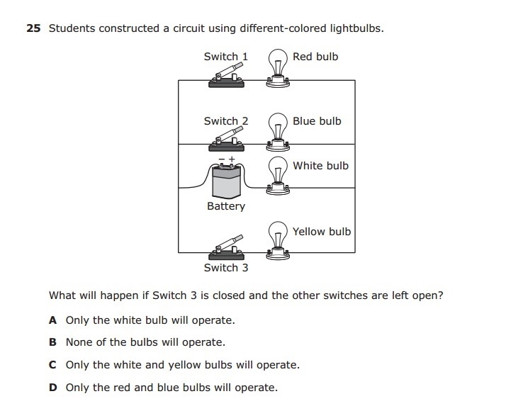 C because it switch 1 and 2 are left open the energy from the battery can only circuit through the white and yellow bulbs