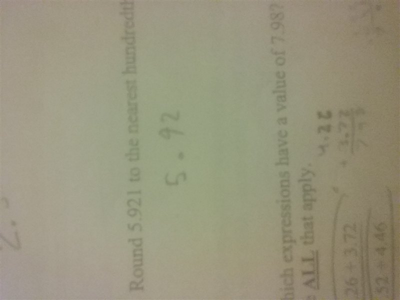 It would be 5.92 because when you round to a certain place, you base it off of the number to the right of that place. Since 1 is less than 5 you would keep everything before 1 the same and make the 1 a zero.