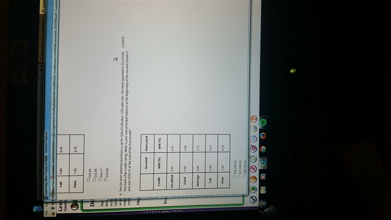 4. you (or your parents) purchase a car for $28,125 plus 7.5% sales tax. The down payment is $3,125. You have a fair credit rating. What is your new principal balance at the beginning of the second month if you pay $529.79 at the end of the first month?