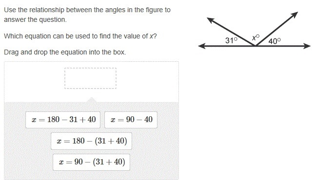 The answer should be "109" because half of a circle is 180, then you subtract 31 and 40 then your answer for "x" should be 109