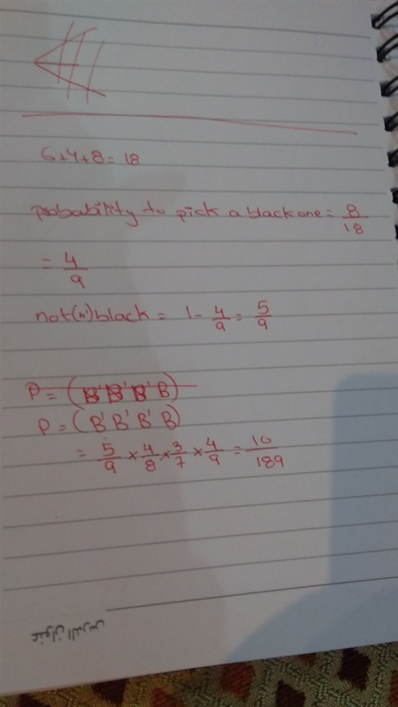 You have a box containing 6 white, 4 red, and 8 black marbles. You pick a marble and it is red. You then pick a white marble. On the third attempt, you pick a white marble again…