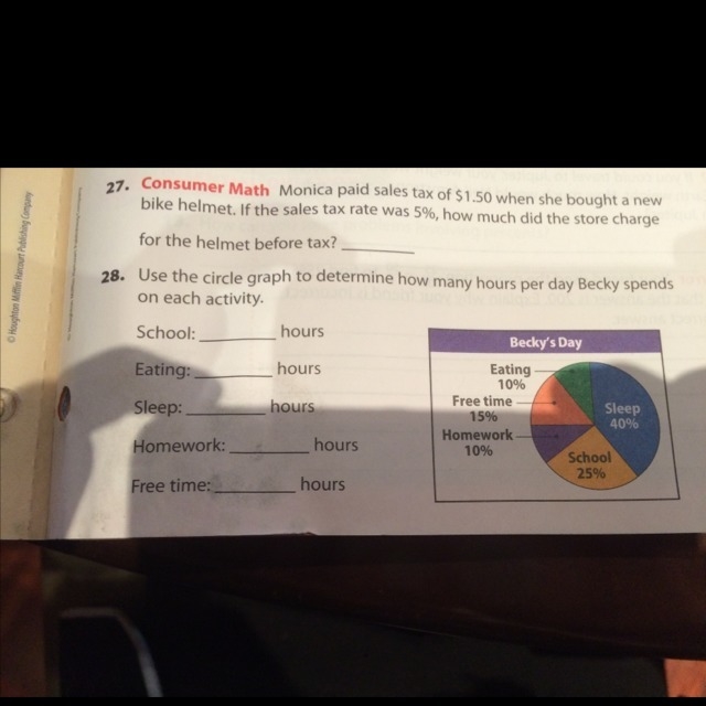 Use the circle graph to determine how many hours per day Becky spends on each activity