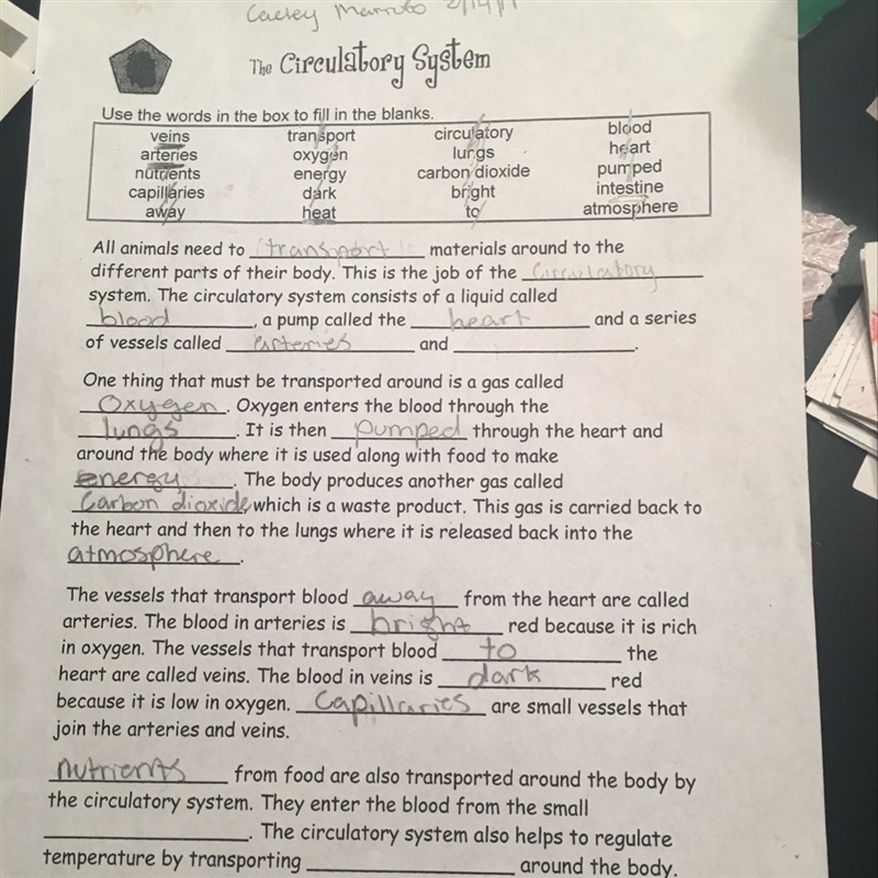 Arteries and VEINS for the first one. The "They enter the blood from the small INTESTINE. The circulatory system also helps to regulate temperature by transporting HEATaround the body