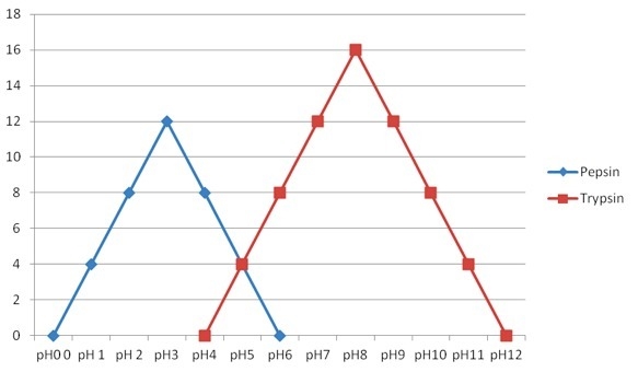 Trypsin 11. Like all proteins enzymes are denatured by extremes of pH. Each enzyme has a preferred pH range for optimum activity. a. State the optimum pH for each enzyme. Pepsin Trypsin b. Pepsin breaks