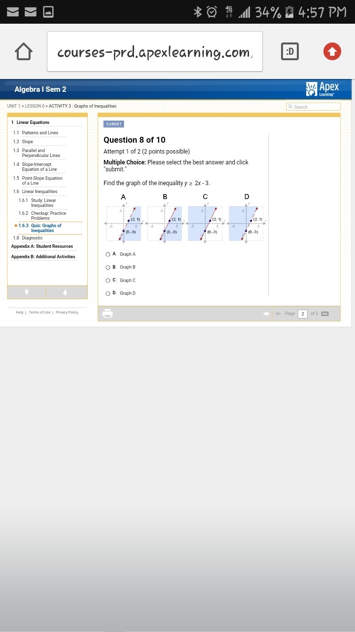 Nevermind I zoomed in. The answer is C because ≤ or ≥ needs a solid graph line, and since it is ≥ the shading should be on the top side of the line.