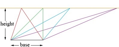Triangles that have the same base and height must have the same area. The area of a triangle is its base multiplied by its height and divide by two. So if the base and height are the same, the area must be too.