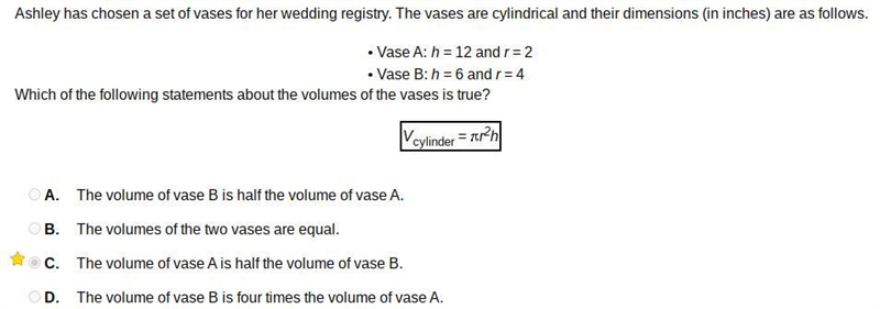 Jodie has chosen a set of vases for her wedding registry. The vases are cylindrical and their dimensions (in inches) are as follows. • Vase A: h = 12 and r= 2 • Vase B: h = 6 and r = 4 Which of the following