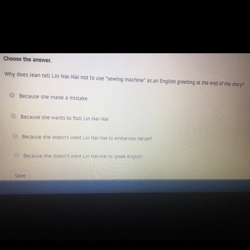 In Homesick: My Own Story by Jean Fritz the reason why Jean tell Lin Nai-Nai not to use "sewing machine" as an English greeting at the end of the story is C: because he doesn't want Lin Nai-Nai to embarrass herself.