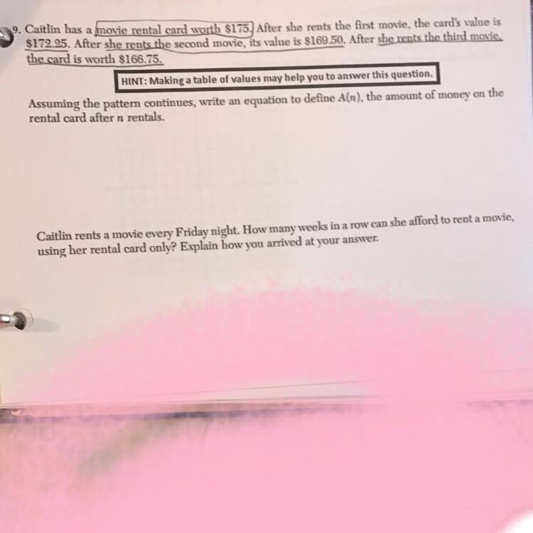 If the pattern continues, it could be 2.75 * 63.63 repeating to get to the end of the card. The second answer is 63. When she started the card, she had $175. Divide 175 by 2.75 and you get 63 repeating.