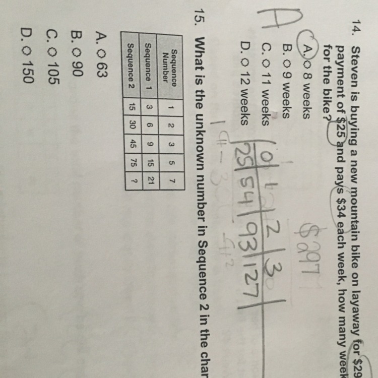 The answer is 105. If you look at the pattern, sequence 2 goes up in 15. 75 + 15 + 15 = 105.
