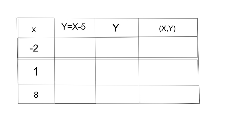 Find three ordered pairs for the equation y = x – 5 using the chart below. [Note] It would preferable if the equation used to solve the table is provided.