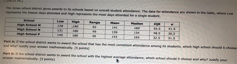 Part A: If the school district wants to award the school that has the most consistent attendance among its students, which high school should it choose and why? Justify your answer mathematically.