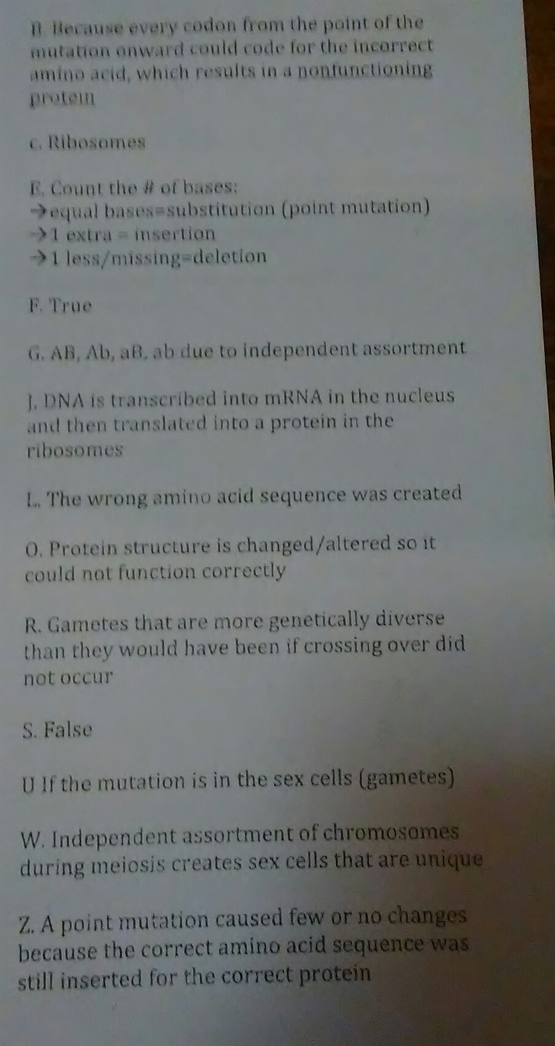 I believe the correct response would be R. Crossing over, results in alleles of genes to be in different places of the homologous chromosomes, resulting in different alleles to be accounted for in the resulting gametes, the fusion of these differently organized and mixed sets of chromosomes results in genetic diversity in the organism.