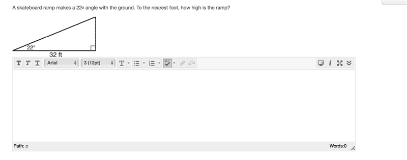 We know the angle is 22*. The height of the ramp is on the OPPOSITE side of the angle. The known length of 32 ft is the ADJACENT side of the angle.