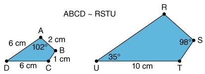 all the angles in figures are same as the same angle in their similar figure. therefore, angle URS = 102 too. as we already got 3 of the angles of the quadrilateral, we can easily calcutae angle T.
